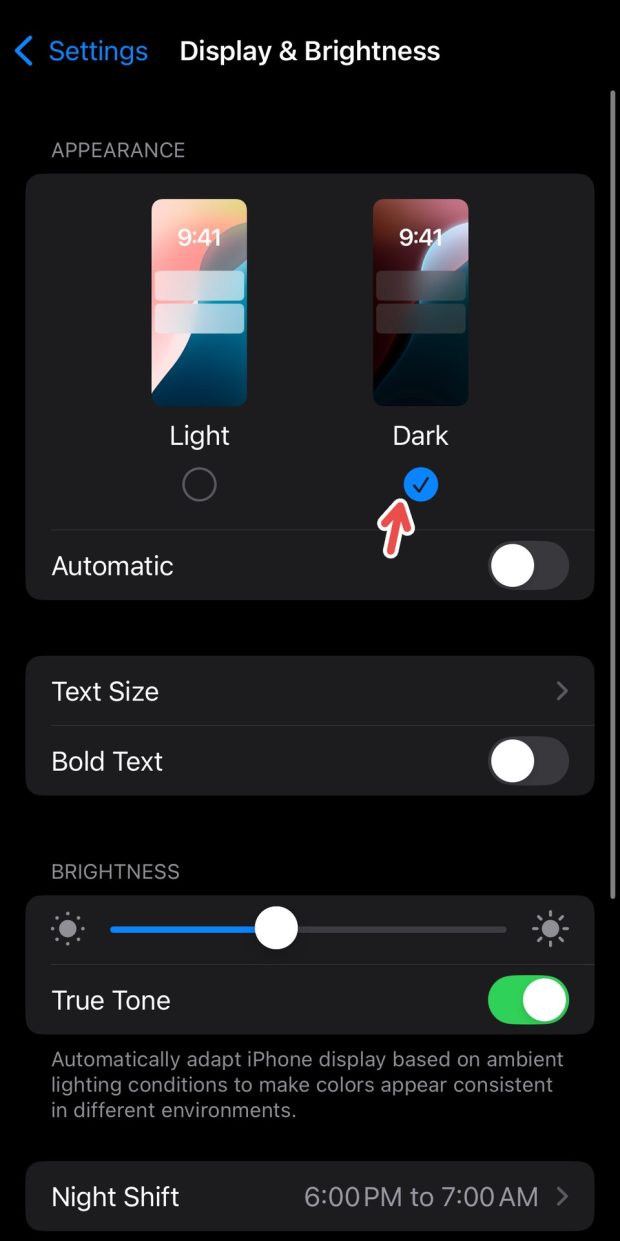 Night Shift نمایشگر گوشی را به سمت طیف گرم‌تری از رنگ‌ها سوق می‌دهد که دیدن صفحه را در تاریکی آسان‌تر می‌کند. برای فعال‌سازی به Settings > Display and Brightness > Night Shift بروید و زمان شروع و پایان را تنظیم کنید.
